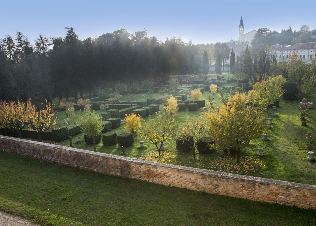 Di fronte alla Villa si trova il giardino formale con siepi di bosso e quattro monumentali tassi. Il “brolo”, con alberi da frutta e orti coltivati con verdure e fiori è uno dei pochi sopravvissuti nei giardini veneti.